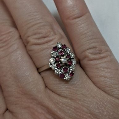 Bague marquise or gris rubis diamants