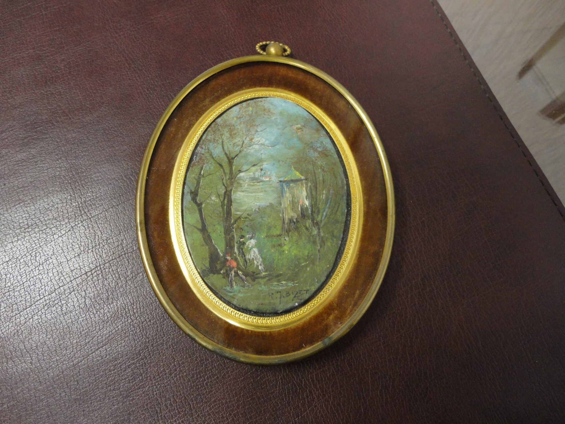 Miniature ovale signée R.M.Bizet, paysage de sous-bois